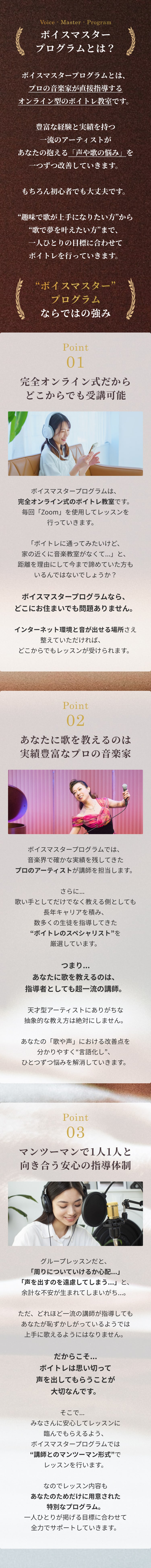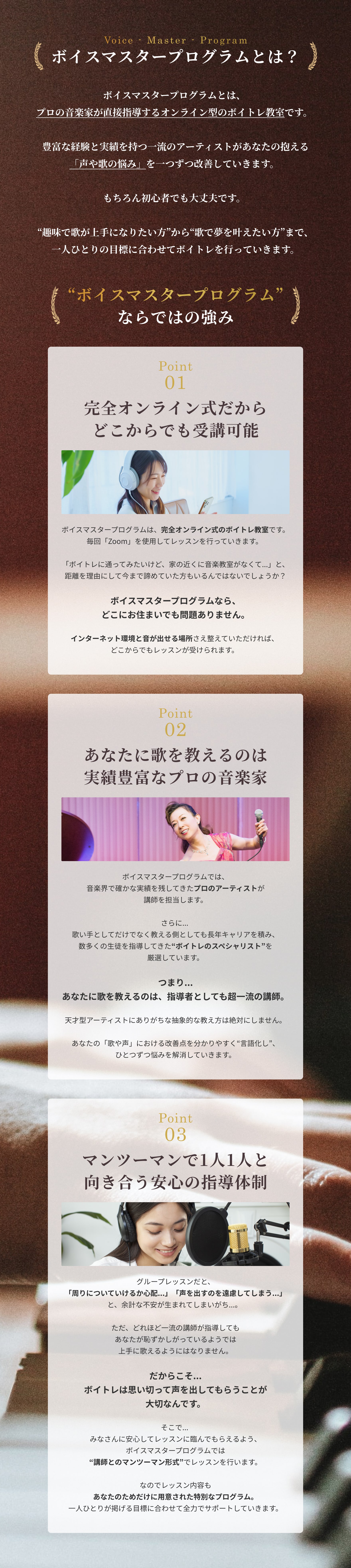 ボイスマスタープログラムでは、一人ひとりの『なりたい姿』 から逆算して指導方針を決定します。歌のオーディションに合格したい人から趣味で歌が上手になりたい人まで、それぞれ目標があるはず。なので、あえて固定のカリキュラムは用意していません。各自のゴールに最短で辿り着くために、最適な指導スタイルを選んでレッスンを行います。